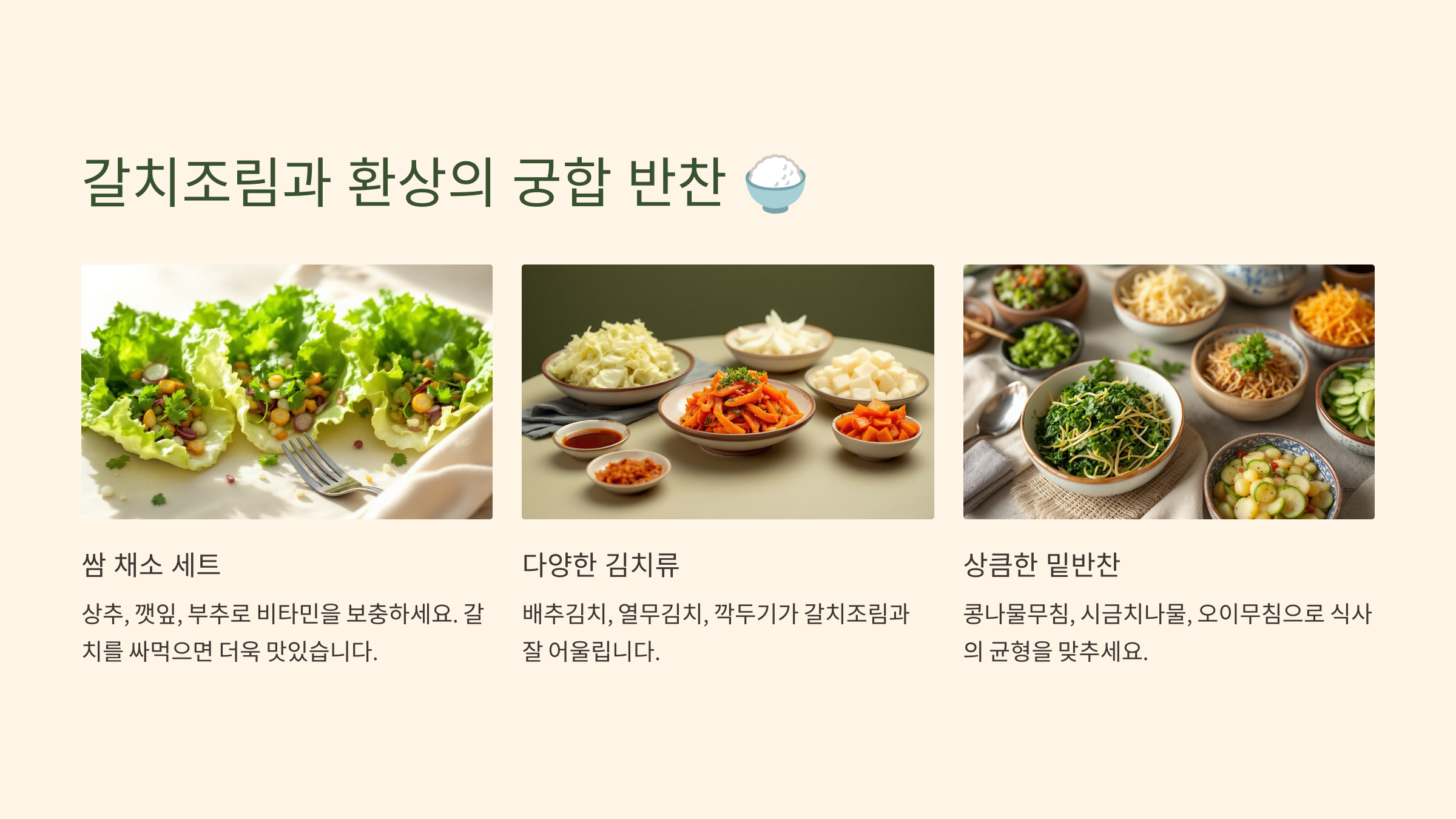 갈치조림은 단독으로도 훌륭하지만, 잘 어울리는 반찬과 함께하면 식사의 즐거움이 배가돼요. 매콤하고 진한 갈치조림과 궁합이 좋은 반찬들은 대체로 담백하거나 새콤한 맛을 가지고 있어요. 맛의 균형을 잡아주는 게 포인트랍니다!